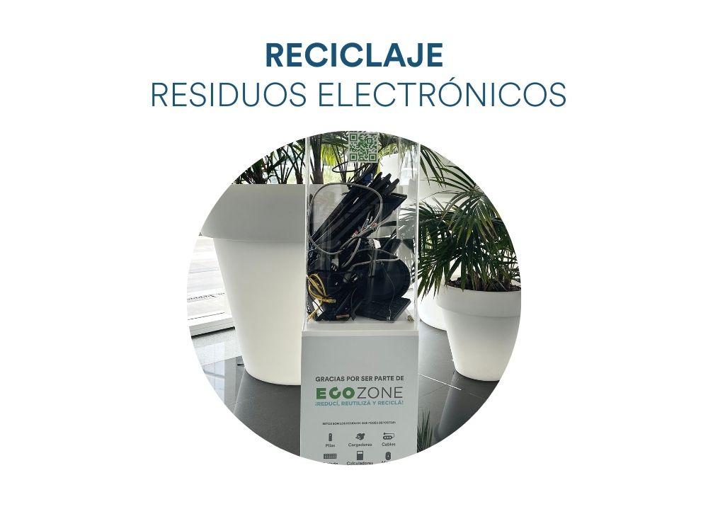 En las recepciones de Torre 1 y Torre 2 vas a encontrar contenedores específicos para pequeños residuos electrónicos de oficina. Allí podrás depositar: